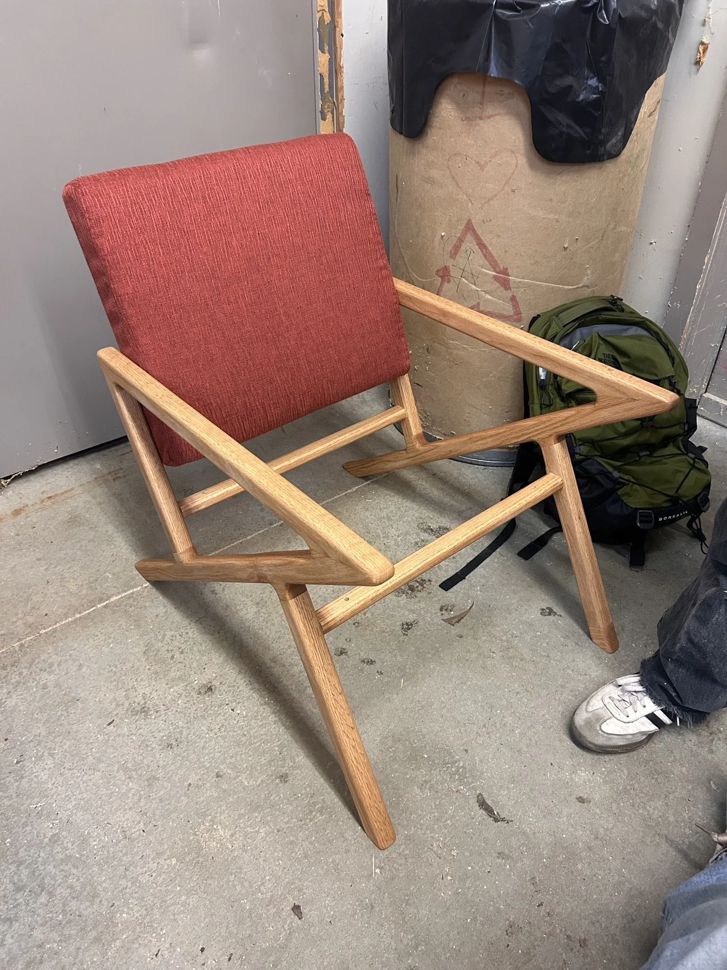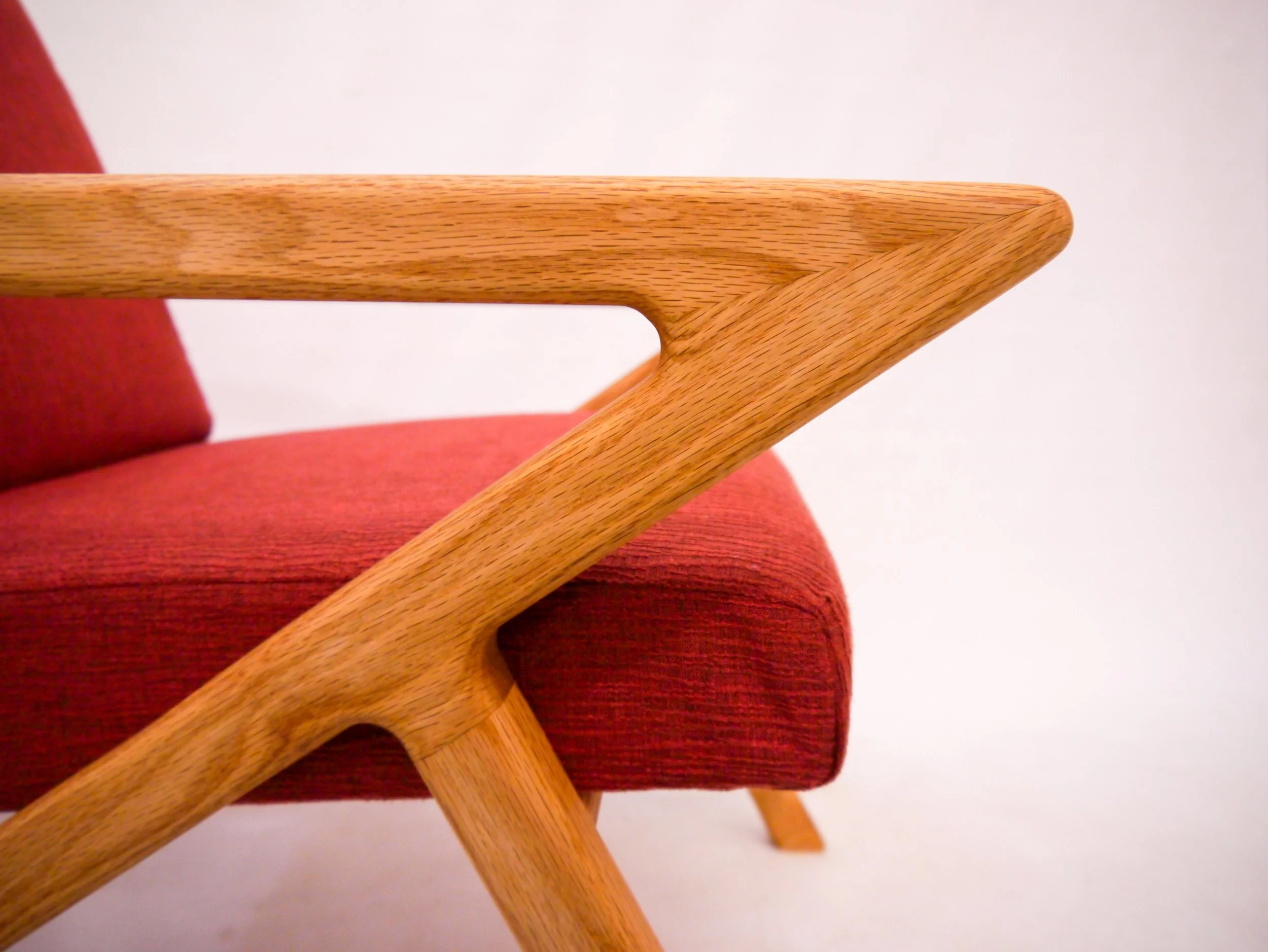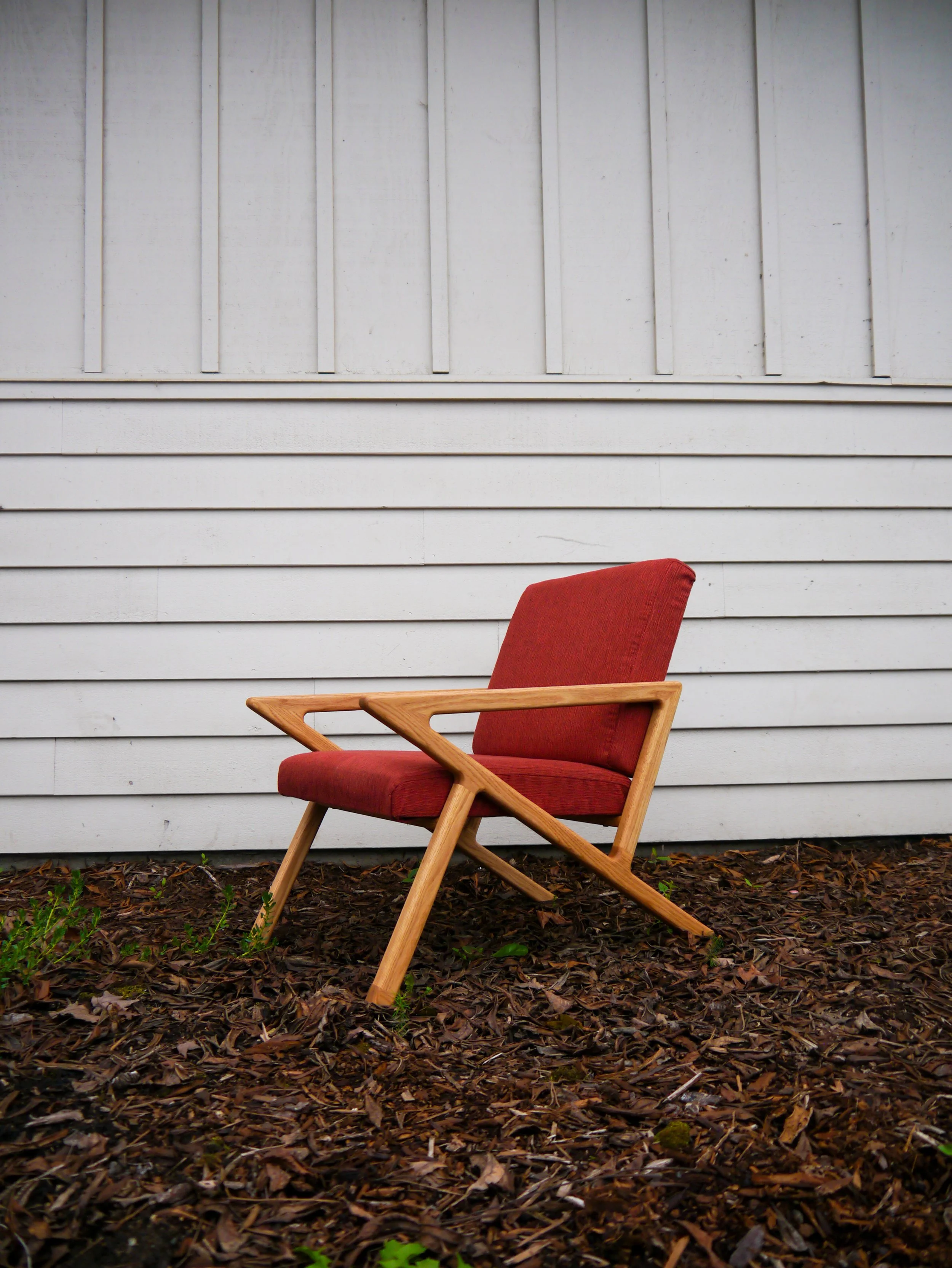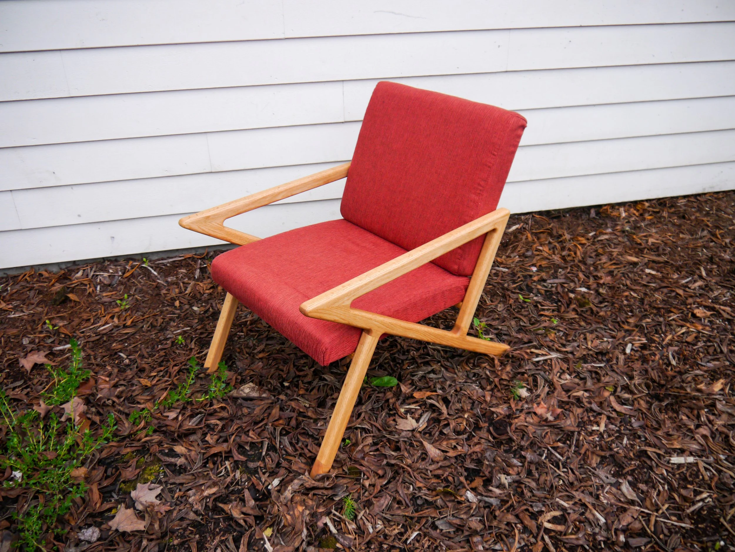 The Iset lounge chair pairs angularity and craftsmanship to create an eye-catching piece of furniture, combining red oak wood and upholstery fabric that creates a vintage look while still appealing to modern sensiblities.